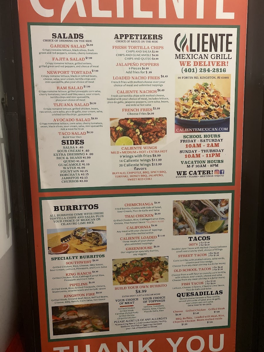 When you're craving bold flavors and a festive atmosphere, look no further than the Caliente Mexican Grill Menu. Located in Kingston, RI, this spot offers a wide variety of traditional Mexican dishes that will transport your taste buds straight to Mexico. From sizzling fajitas to mouthwatering tacos, the menu is packed with vibrant options. Whether you're in the mood for a classic burrito or a fresh, zesty guacamole to start, there's something for everyone. For those looking to add a bit of spice to their meal, the house-made sauces and seasonings won't disappoint. The relaxed, friendly vibe makes it the perfect place for enjoying a delicious meal with friends or family.